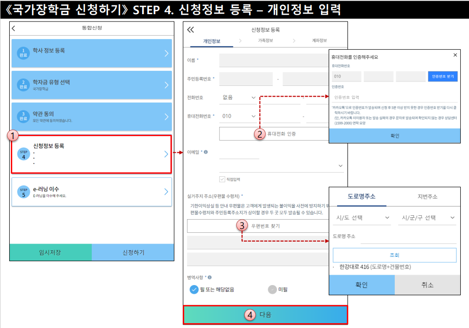 이후, 안내에 따라 신청서를 작성합니다. 신청 동의 및 서약, 학교정보 입력, 개인정보 입력, 학자금유형을 선택하면 통합 신청이 가능합니다. 마지막으로 국가장학금 한눈에 보기 E-러닝까지 완료하면 최종적으로 신청서 제출이 완료됩니다.
