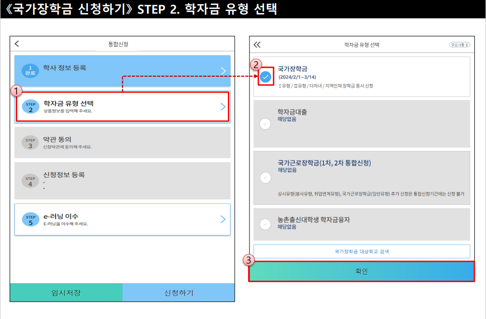 모바일 앱의 메인화면에서 2024학년 1학기 국가장학금 1차 신청을 눌러 주시고, 누리집과 마찬가지로 학사 정보 등록부터 E-러닝 이수까지 완료하면 신청됩니다.